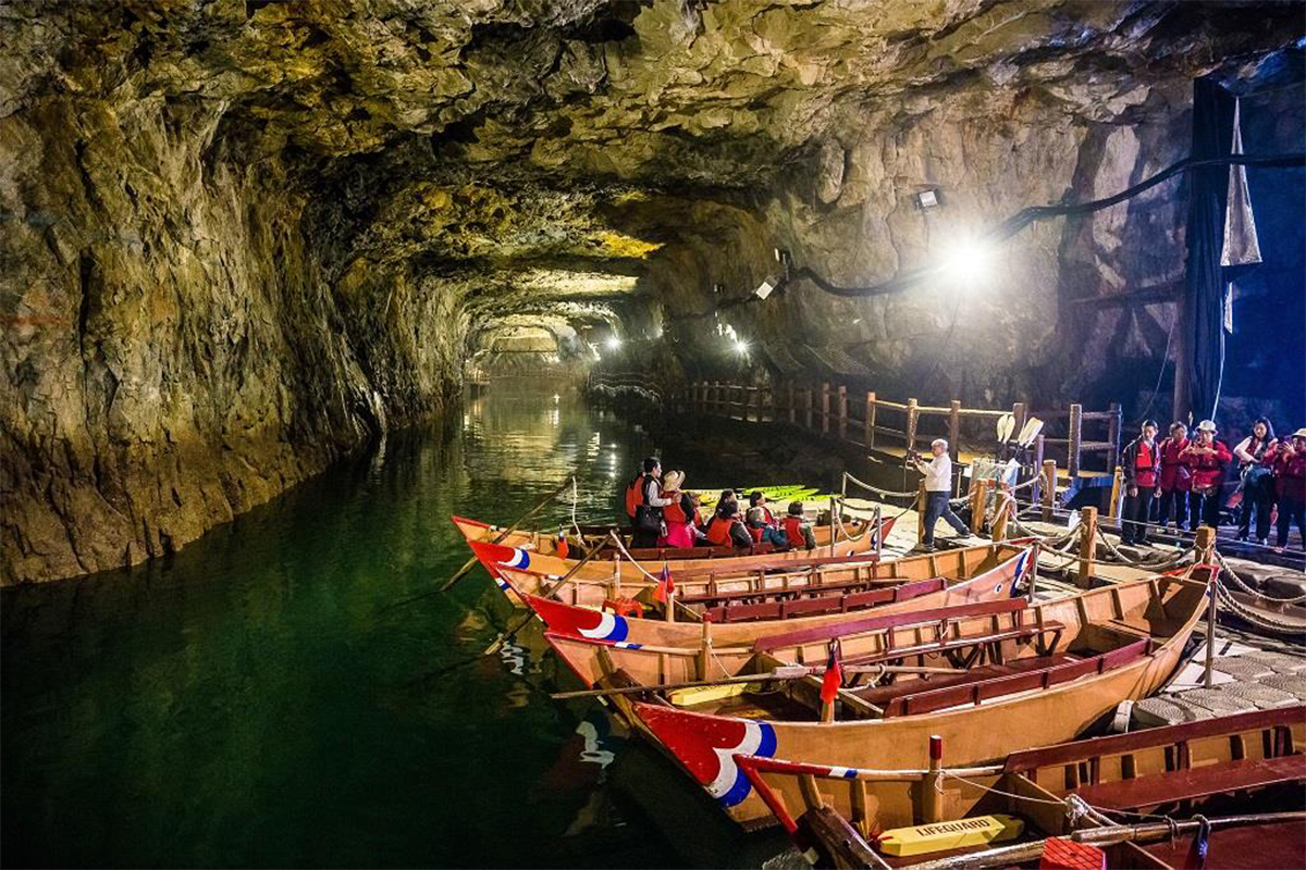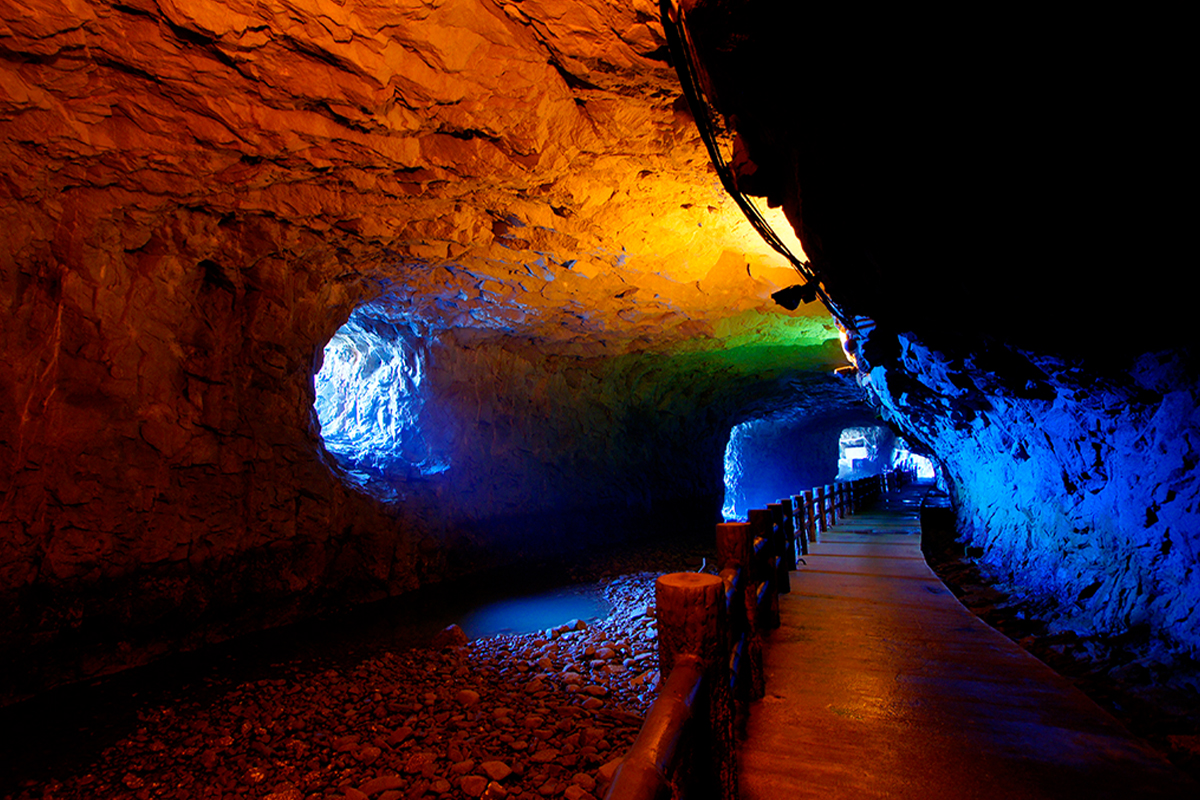 北海坑道是馬祖最著名的戰地景點之一,為軍方開鑿於花崗岩內的海蝕坑道,全長約 700 公尺,曾作為登陸艇的隱藏通道。坑道內氣氛幽深壯麗,搭配燈光投射,倒影如鏡。夜晚還可體驗搖櫓行舟與欣賞藍眼淚奇景,浪漫又震撼。