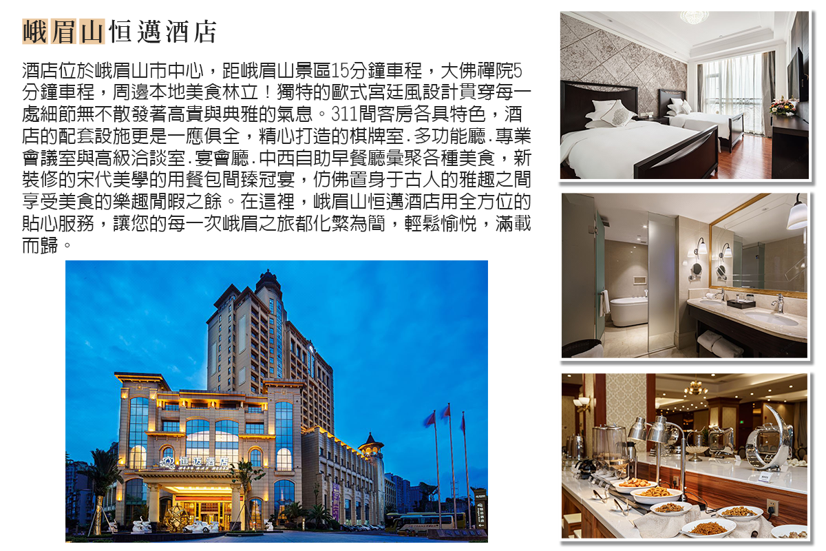 住宿:峨嵋恒邁酒店 或 橘子樹酒店 或同等級