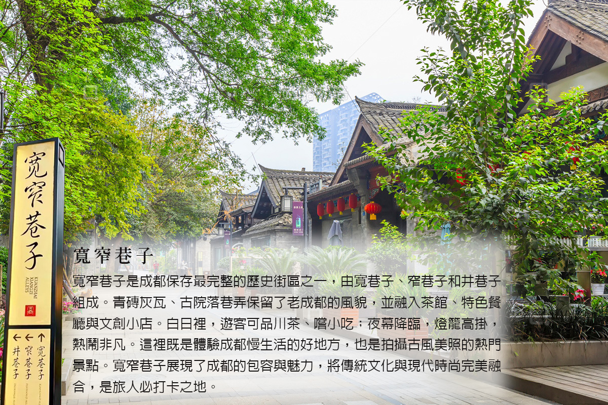 寬窄巷子由寬巷子、窄巷子與井巷子組成,是成都最具代表性的歷史文化街區。這裡保留了青磚灰瓦的明清院落,融合茶館、特色小店與文創空間,既古色古香又充滿時尚活力。白天可在茶館小憩,品茗川茶;夜晚燈火輝映,遊人如織,熱鬧非凡。來此漫步,既能感受老成都的慢生活,也能體驗現代都市的文藝氛圍,是必訪的城市名片。