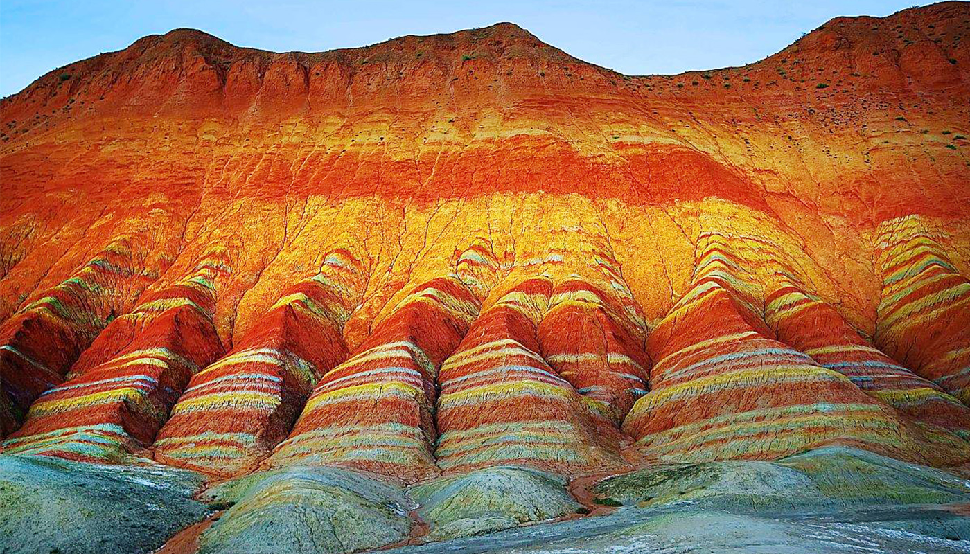 張掖七彩丹霞以層層彩色岩層聞名,是中國最壯觀的丹霞地貌之一。紅色、橙色、黃色與灰白色岩層在歲月風化與地殼運動作用下形成獨特紋理,宛如大自然繪製的巨大畫布。日出或日落時,陽光灑落在山體上,色彩更加鮮明壯麗。站在觀景台遠望,連綿起伏的彩色山丘氣勢恢宏,被譽為「大地的調色盤」。