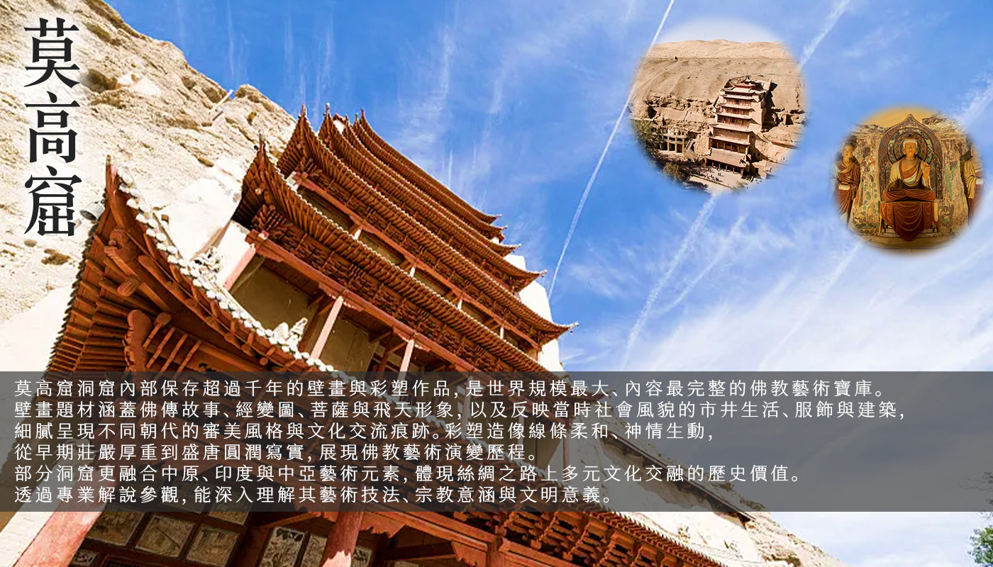 莫高窟被譽為「東方藝術寶庫」,是世界著名的佛教石窟藝術中心之一。洞窟始建於十六國時期,歷經千餘年不斷開鑿與修建,保存了大量精美壁畫與彩塑。洞窟內的佛像、飛天與宗教故事壁畫色彩絢麗、造型生動,展現出古代藝術與宗教文化的高度成就。這裡不僅是中國文化瑰寶,也被列為世界文化遺產。