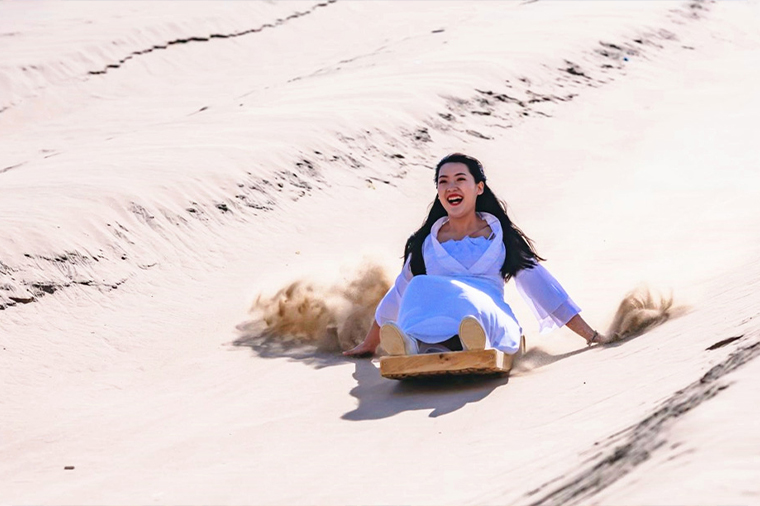 在鳴沙山體驗滑沙,是敦煌旅遊最刺激有趣的活動之一。遊客登上高聳沙丘後,坐上滑沙板從金色沙坡快速滑下,沙粒隨著滑行飛揚,帶來速度與樂趣兼具的體驗。從沙丘頂端俯瞰,可遠望月牙泉與廣闊沙海,壯麗景色令人難忘。滑沙不僅充滿冒險感,也讓人親身感受大漠的浩瀚與魅力。