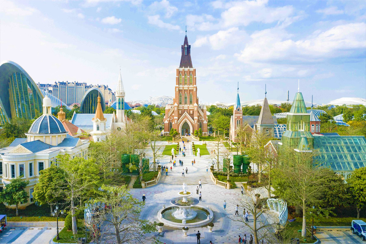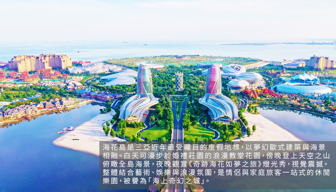 坐落於海花島核心區,融合歐式古典與浪漫海景設計,擁有多座主題教堂與花園式婚禮場地。白色尖塔映襯碧海藍天,是拍婚紗與舉辦浪漫儀式的夢幻之地。