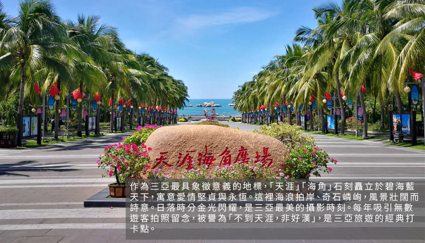 三亞最具代表性的地標之一,以巨石上刻有「天涯」「海角」而聞名。海浪拍岸、礁石林立,寓意「愛情與永恆」。是婚紗拍攝與觀光留念的熱門景點,來三亞必到的象徵性之地。