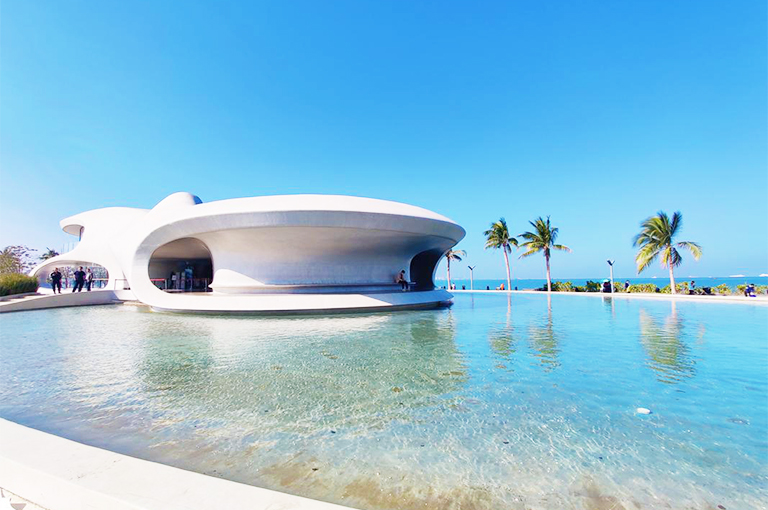 位於海口市西海岸,純白的弧形建築如漂浮雲朵,被譽為「最美海邊圖書館」。內部以極簡設計與開放式閱讀空間為主,窗外即是海天一線的景色,靜謐又詩意,是文青與攝影愛好者的夢幻地標。