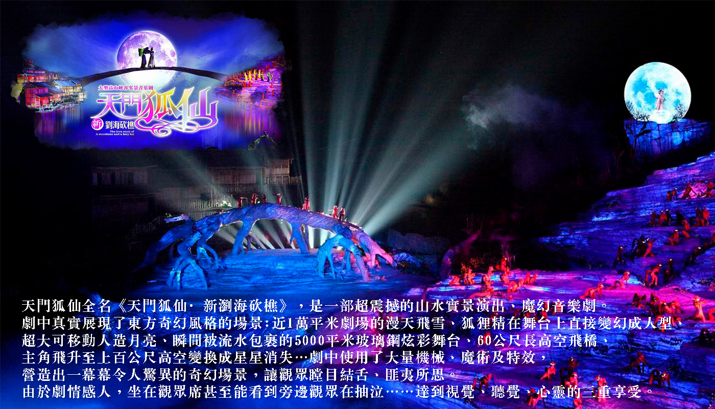 《天門狐仙》是張家界大型山水實景音樂劇,以天門山奇峰為背景,融合山水、燈光與音樂,場景壯麗。劇情改編自湘西民間傳說,講述人狐相戀的淒美故事,透過精緻舞美與動人歌聲,展現愛情的純真與悲壯。全劇分為多個篇章,將自然山水與舞台表演巧妙結合,觀眾如同置身仙境。演出時群山環繞,配合燈光投影、音效及實景舞台,營造出如夢似幻的氛圍,是張家界夜間最具特色的經典表演之一。(若遇冬季停演,則觀看魅力湘西秀-《魅力湘西秀》以歌舞展現土家、苗族文化,震撼呈現湘西民族風情 )