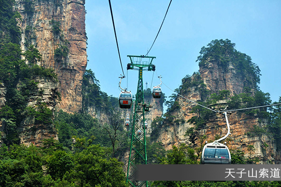 天子山索道是前往張家界天子山的主要交通工具,全長近2,000公尺。搭乘纜車時,遊客能在高空中欣賞連綿的峰林與縹緲雲海,視野遼闊壯麗。天子山以「雲濤、霧海、霞日、冬雪」四絕著稱,乘索道上山的過程,就像親自穿越仙境長廊。抵達山頂後,更能俯瞰萬峰齊立的震撼景象,令人流連忘返。