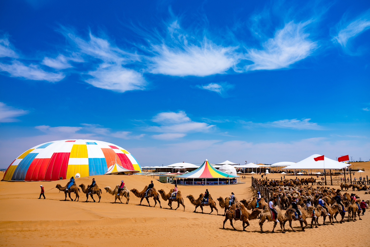 響沙灣位於庫布其沙漠,是中國最具代表性的沙漠旅遊景區之一。沙丘連綿起伏,行走其上會發出獨特的沙鳴聲,因而得名。景區結合自然奇景與完善設施,讓旅客在欣賞壯闊沙漠景觀之餘,也能感受沙海與藍天交會的震撼畫面,是內蒙古不可錯過的自然奇觀。