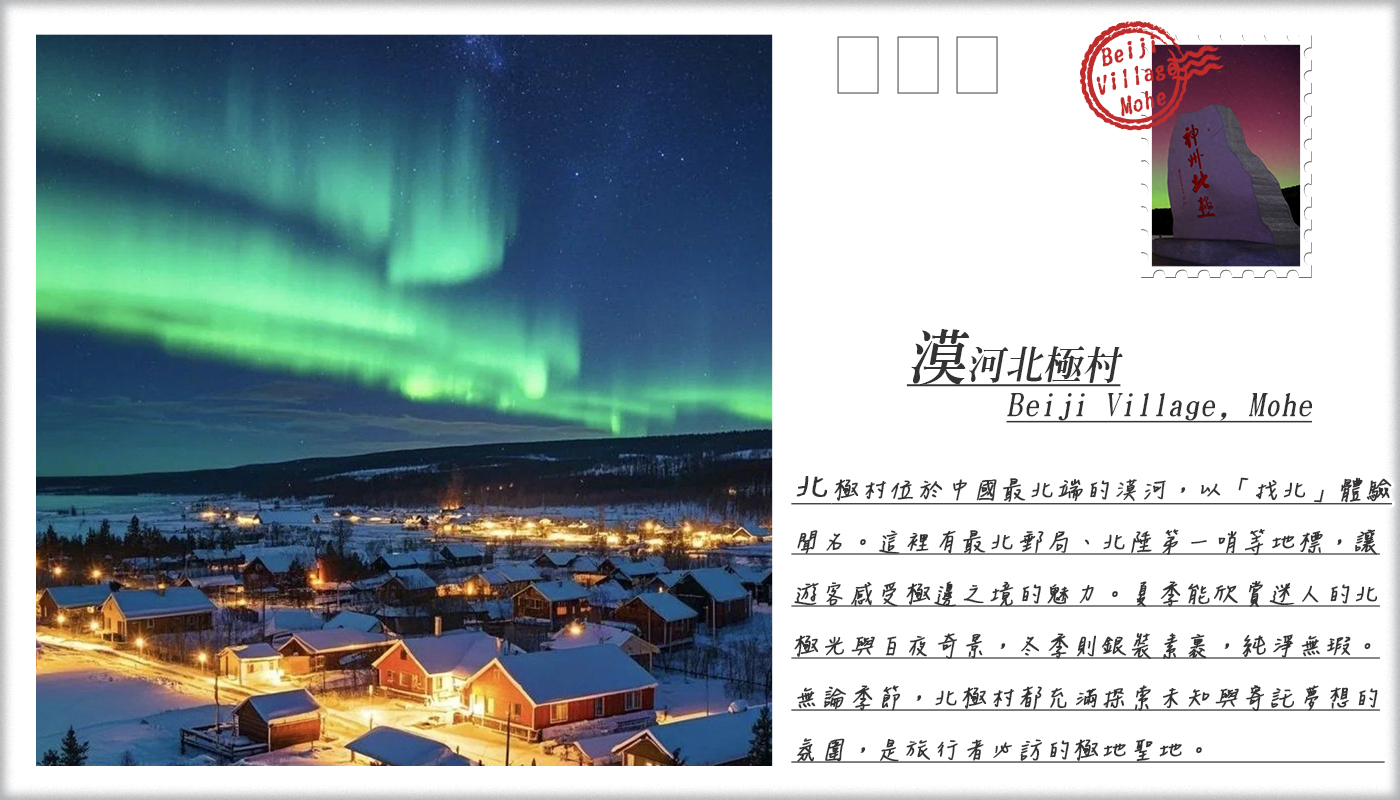 北極村位於中國最北端,是體驗極地風情的聖地。最北一家代表著當地居民的生活故事,展現極地人文。北陲第一哨則象徵邊境守衛的精神,帶有濃厚愛國色彩。而最北郵局則是遊客最愛打卡地,可寄出「最北明信片」。這三處景點串聯出北極村的文化、地理與人文特色。
