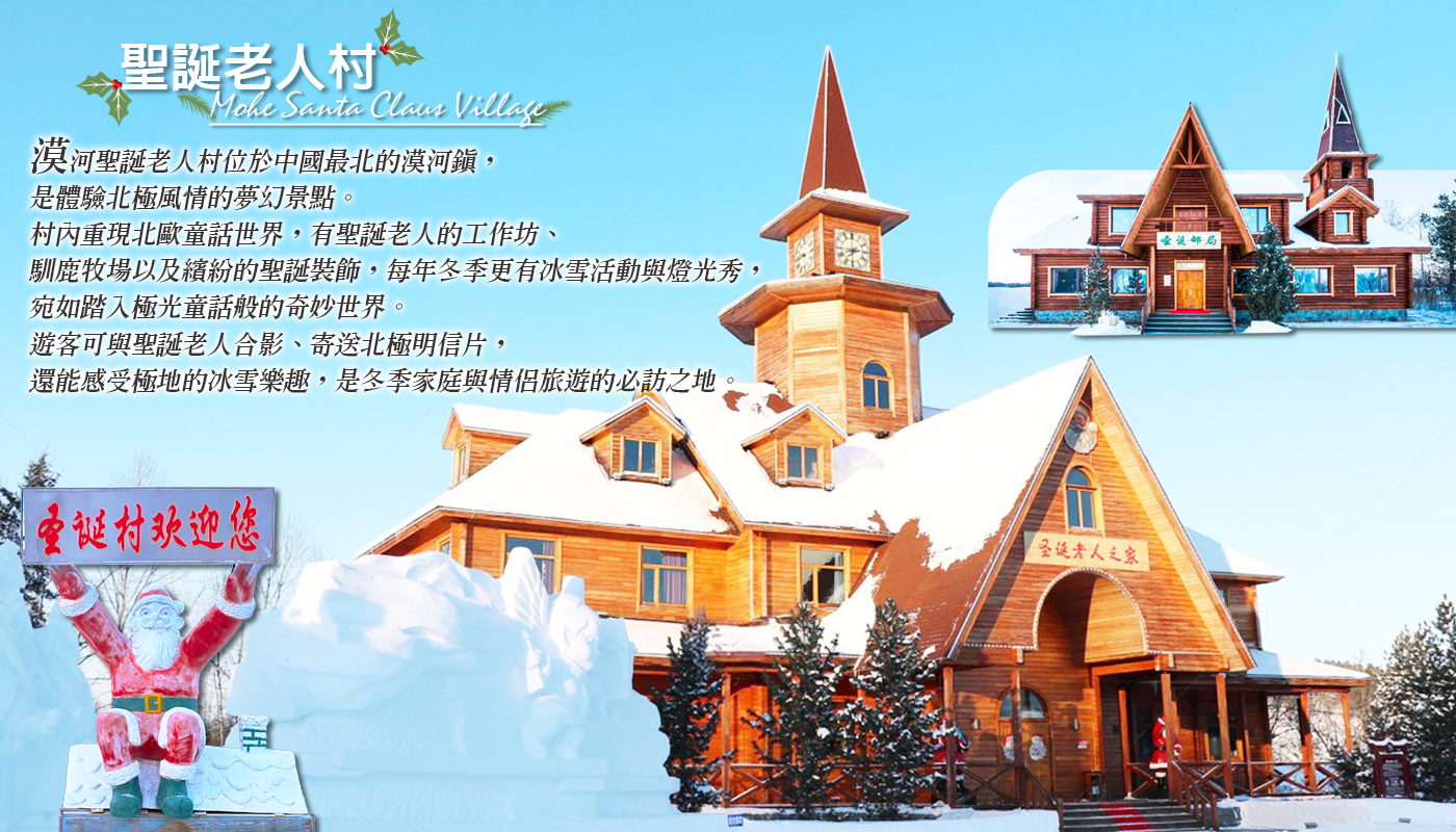 漠河-北極村【北極村風景區(含電瓶車)、參觀神州北極碑、最北一家、北極廣場、北陲第一哨、最北郵局(贈明信片一張)、北極沙洲、金雞之冠廣場觀北極光盛宴(自然現象,以天氣情況為準)。體驗潑水成冰(含電子照片及短影片),聖誕老人村、聖誕郵局、聖誕老人屋、冰雪樂園(體驗冰車,冰扒犁,冰球)】