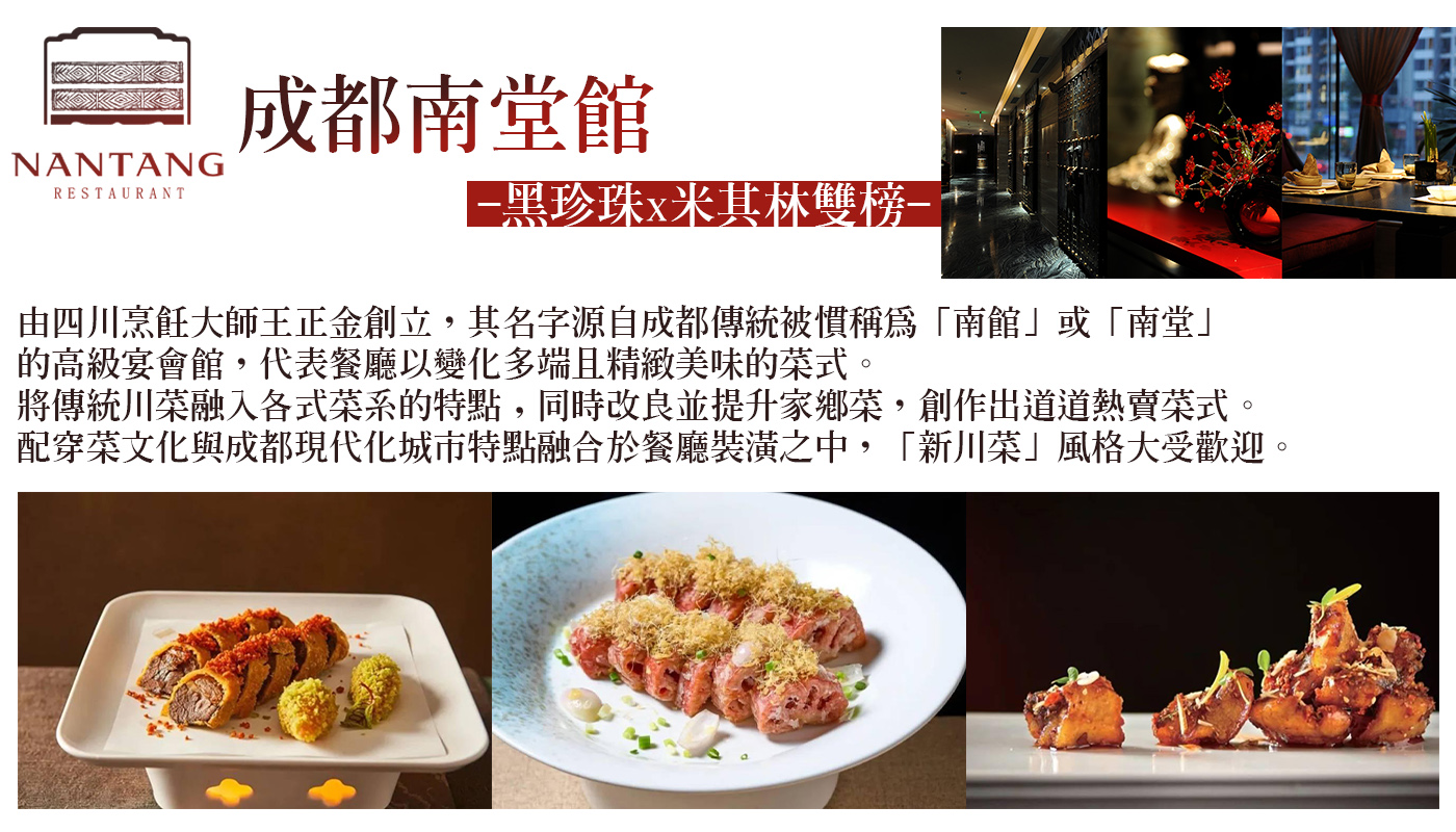 南堂沉澱千年巴蜀歷史文化,擁有百年來的格調,以風味承載昔日煙火人文,以珍饈展現當代南堂品格。在南堂,以一飲一食呈現館派雅緻藝術。