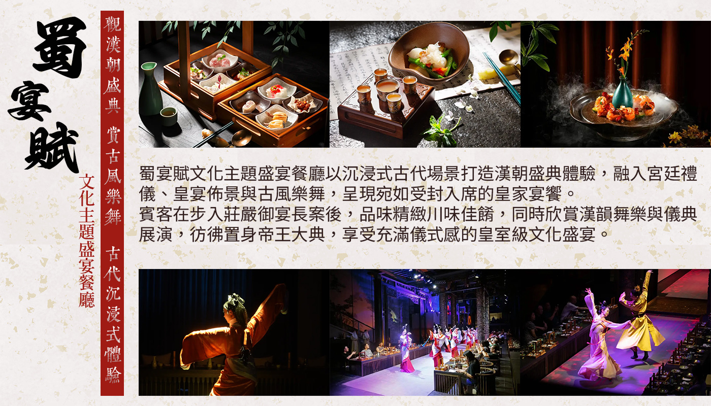 蜀宴賦坐落於成都市成華區東郊記憶•國際時尚產業園,是一個集樂舞演繹、光影藝術、餐飲體驗於一體的原創漢文化餐秀品牌。 作為全新賦能的精品文旅綜合項目,蜀宴賦以漢服文化為創作背景,溯源中國傳統宴飲儀禮,借力川菜文化的歷史脈絡與融合發展,採用專業級舞美舞秀視覺技術,打造全景沉浸式Dinner Show概念的餐秀體驗場景。