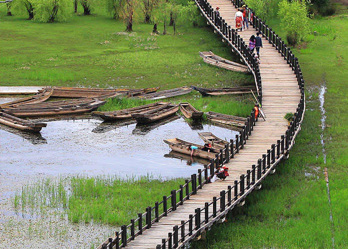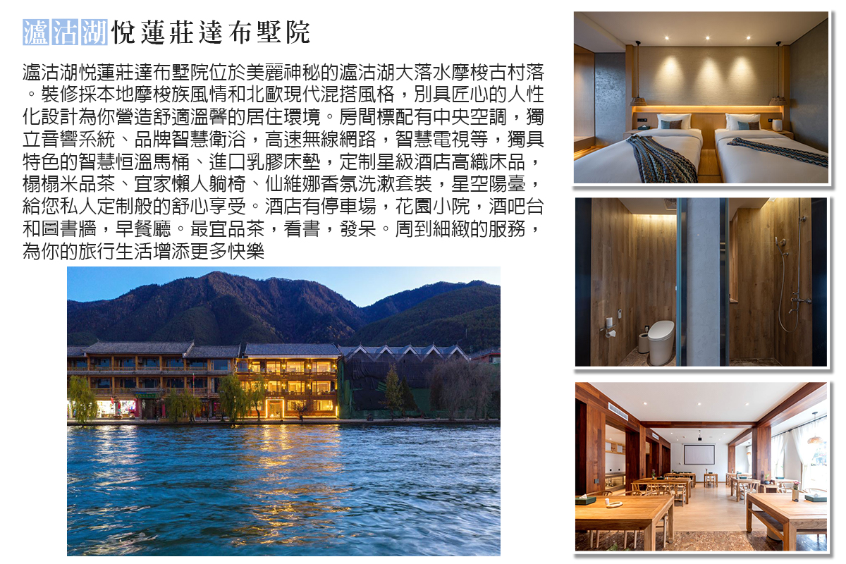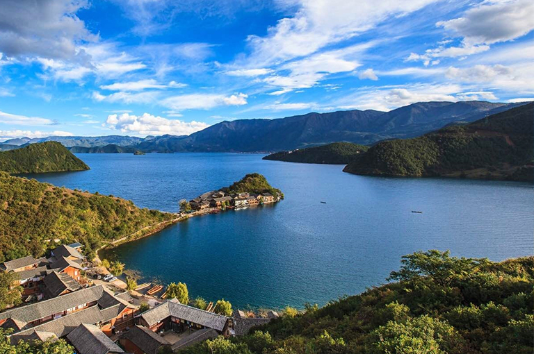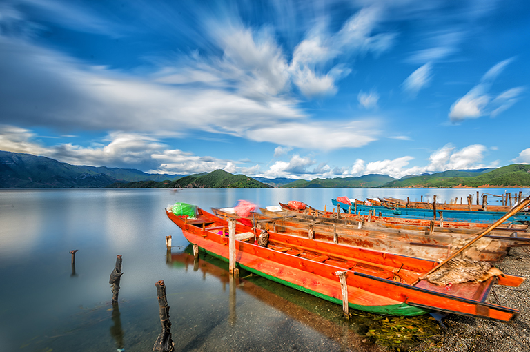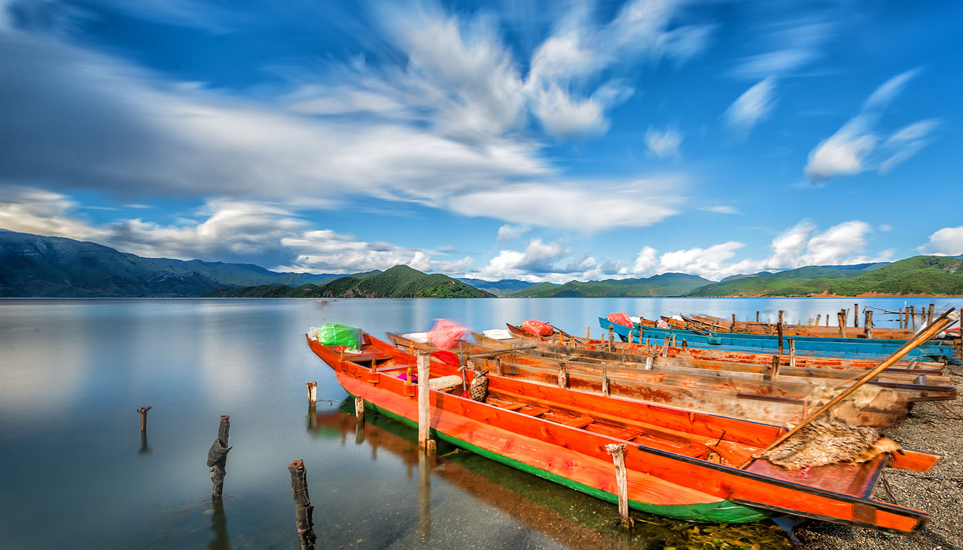 瀘沽湖被譽為「高原明珠」,湖面廣闊清澈,四周環山環水,宛如世外桃源。乘坐傳統豬槽船輕輕劃過湖面,能感受水天一色的靜謐。湖區更因摩梭族的走婚文化而別具魅力,情人灘、走婚橋與篝火晚會展現當地風俗,讓旅人既能親近自然,也能深入體驗摩梭民族的人文風情。