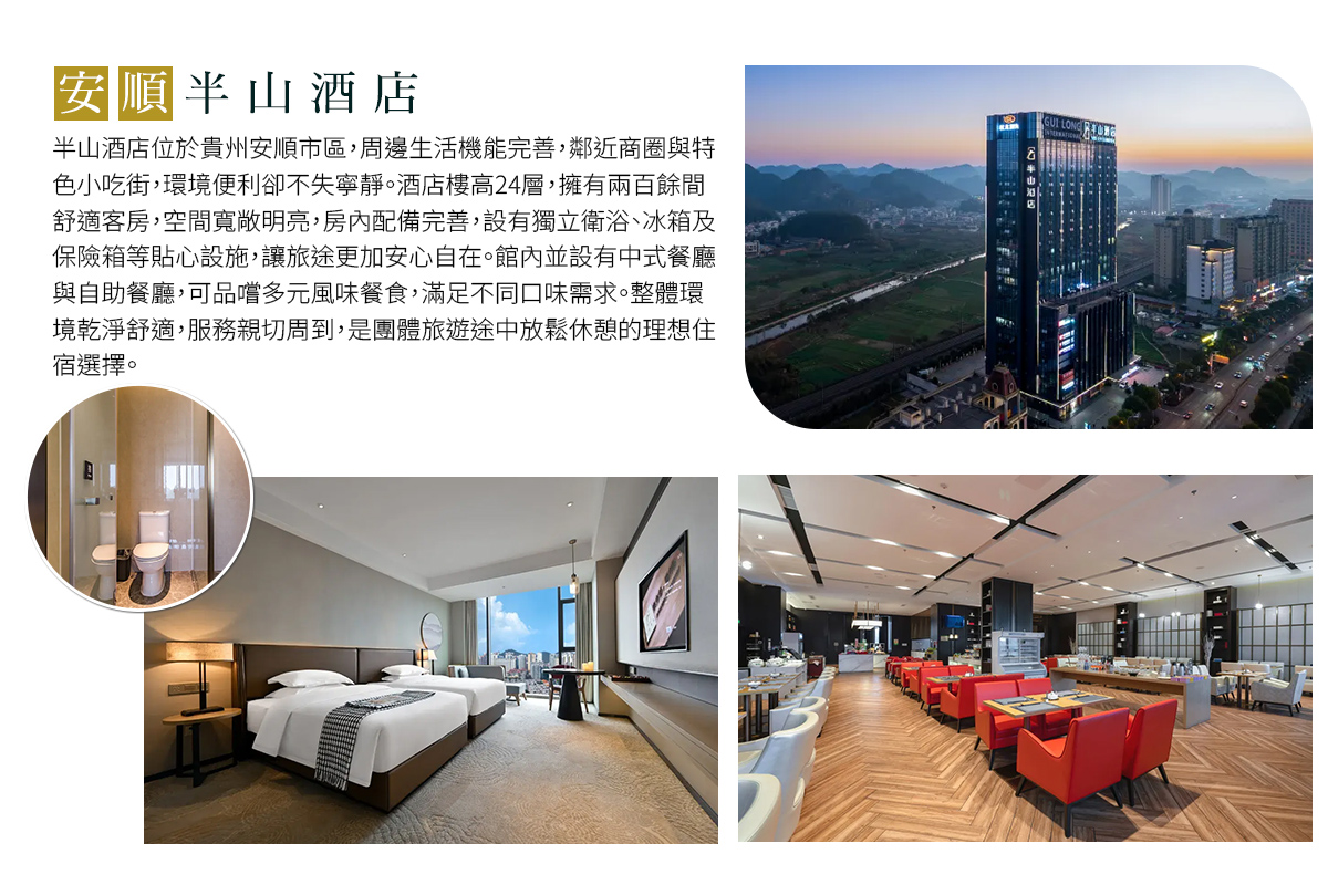 ✦ 貴州多為山區地形,氣候濕潤,早晚溫差較大,部分景區天氣變化快速,建議攜帶保暖外套、薄長袖衣物及雨具(雨傘或雨衣),並備妥個人習慣性藥物,以因應天候與旅途所需。